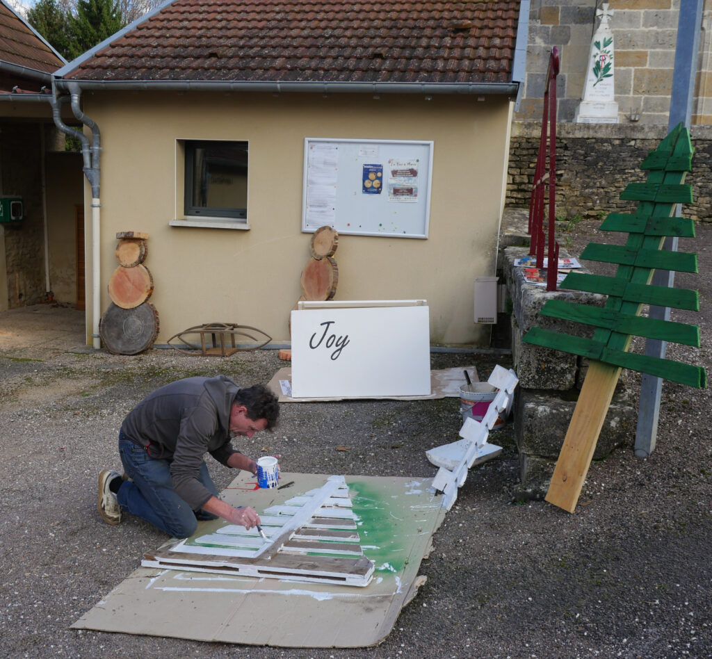 Samedi 8 Novembre un groupe de bénévoles et de conseillers s’est réuni pour créer des décorations de Noel destinées à embellir le village. Tronçonneuses, scies, marteaux et pinceaux étaient de sortie, manipulés avec enthousiasme par nos joyeux lutins pour donner vie à de magnifiques créations à partir de matériaux de récupérations. Des palettes se sont transformées en sapins ou panneaux indicateurs, tandis que des rondelles de bois sont devenues de joyeux bonhommes de neige et de charmants rennes.